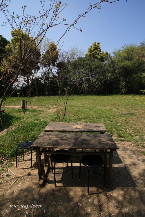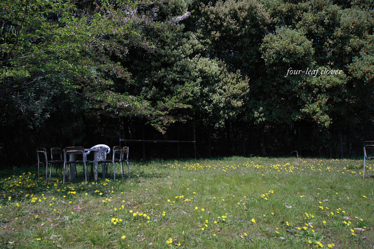 Ⅲ たんぽぽのいっぱい咲くお庭、木陰のテーブル、のどかな光景